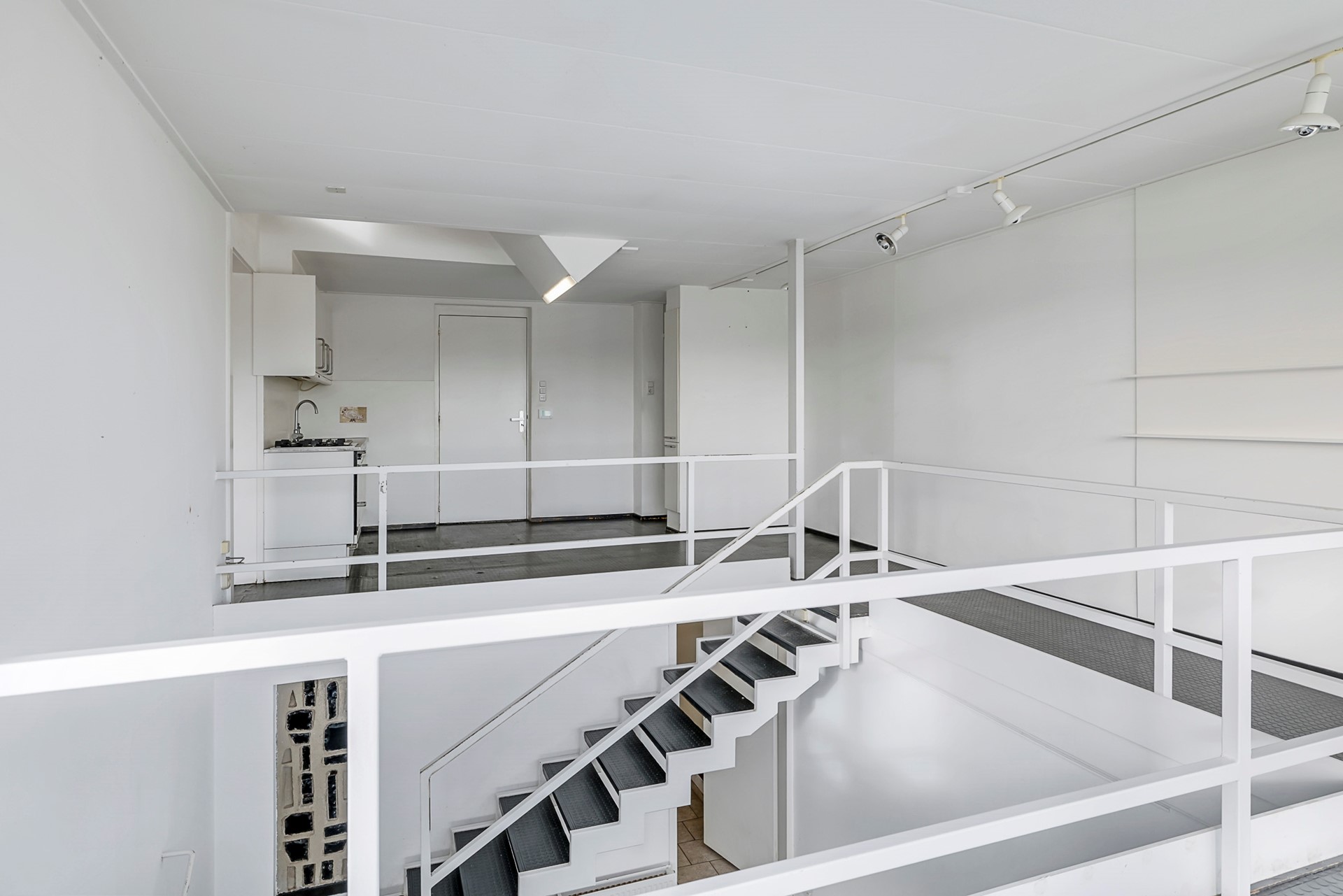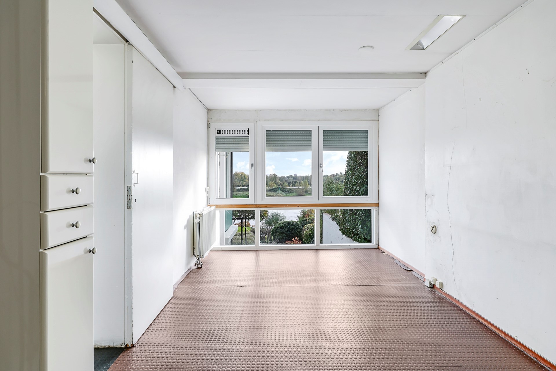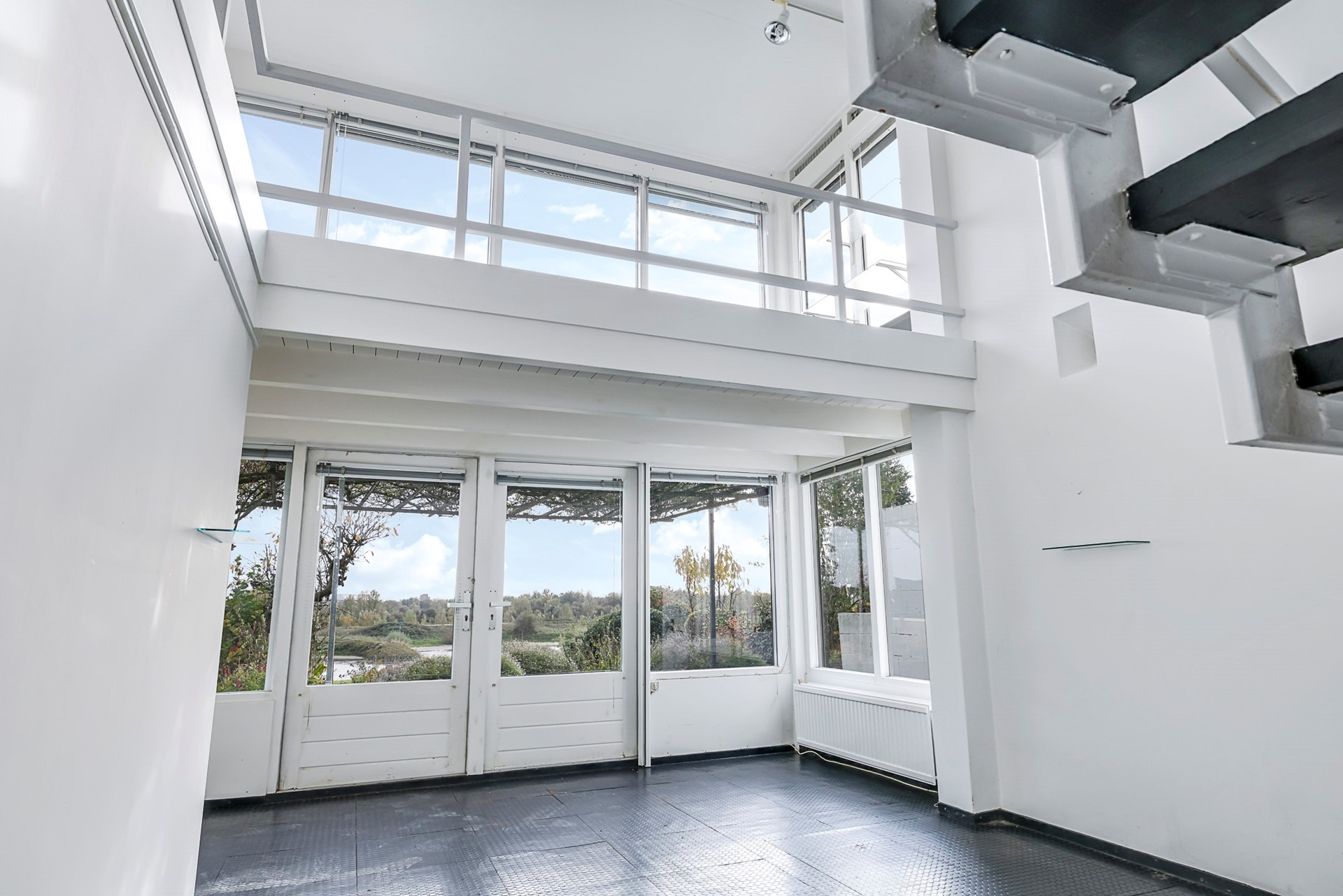 Via de entree van de benedenwoning bereik je een ruime hal met toegang tot meerdere woonkamers, een badkamer en de keuken. De vide brengt hoogte en licht in het interieur en biedt een fraai uitzicht over de Rijn en de uiterwaarden. De leefruimtes vormen samen een royale laag met uitstekende mogelijkheden voor een eigentijdse indeling.