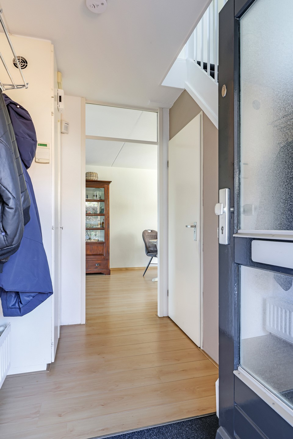 Je parkeert voor de deur op eigen oprit en stapt binnen via de entreehal. Hier vind je ook het toilet met fonteintje. Loop je vanuit de hal de woonkamer in, dan ligt aan de rechterzijde de eethoek met aansluitend aan de voorzijde de keuken. De keuken heeft een U-opstelling met inbouwapparatuur en - niet onbelangrijk - een heerlijk uitzicht op de ruime voortuin terwijl je kookt.