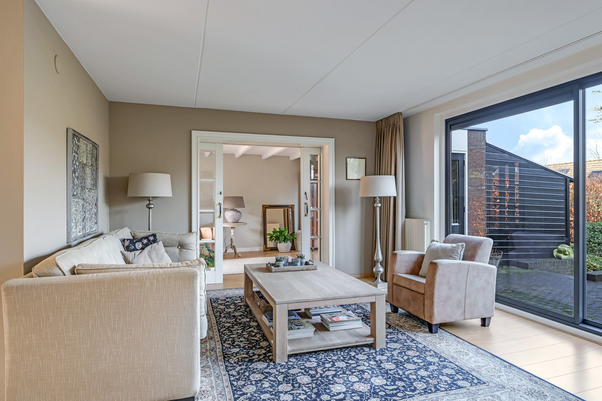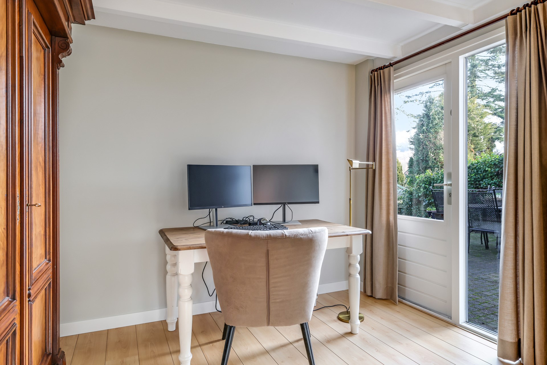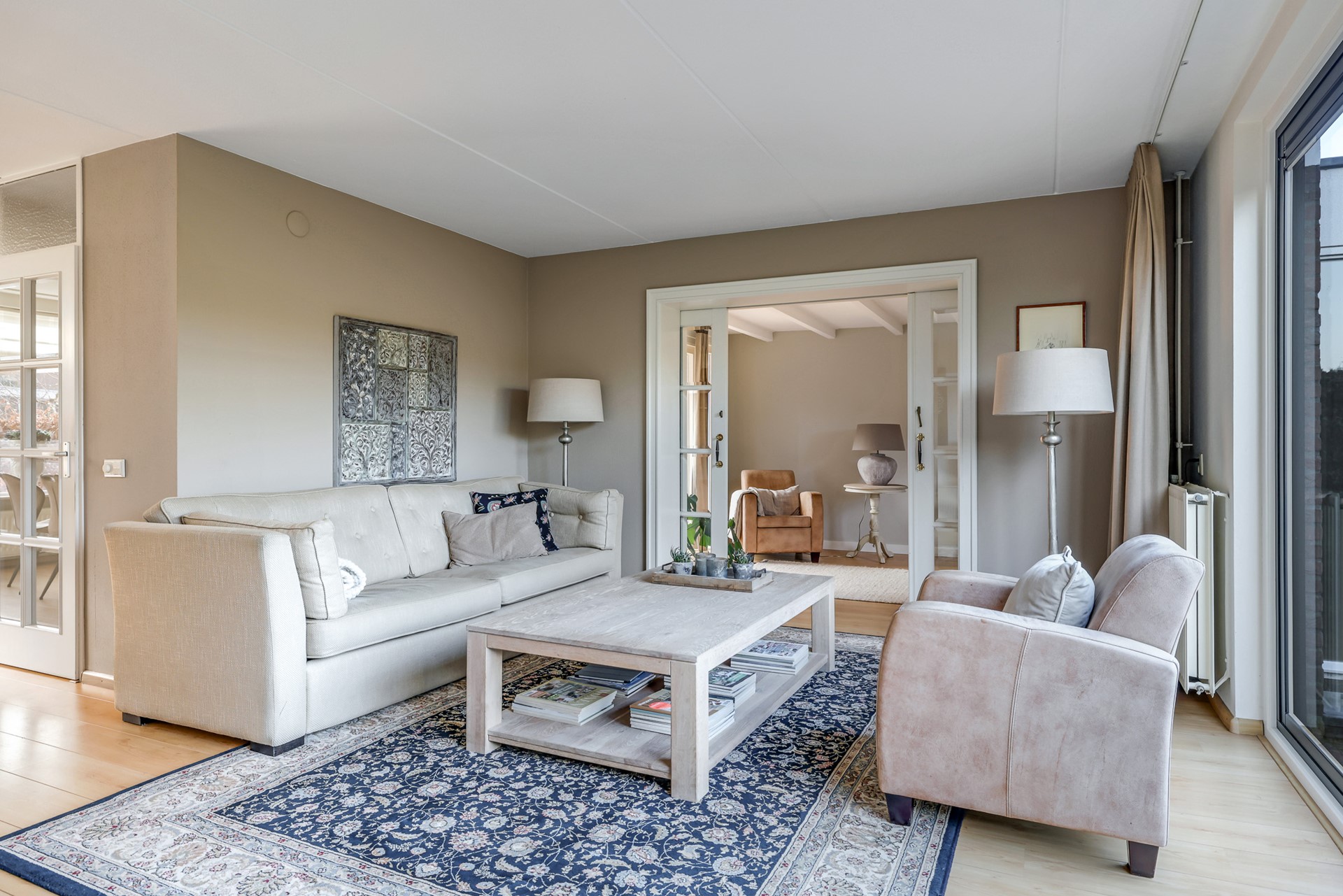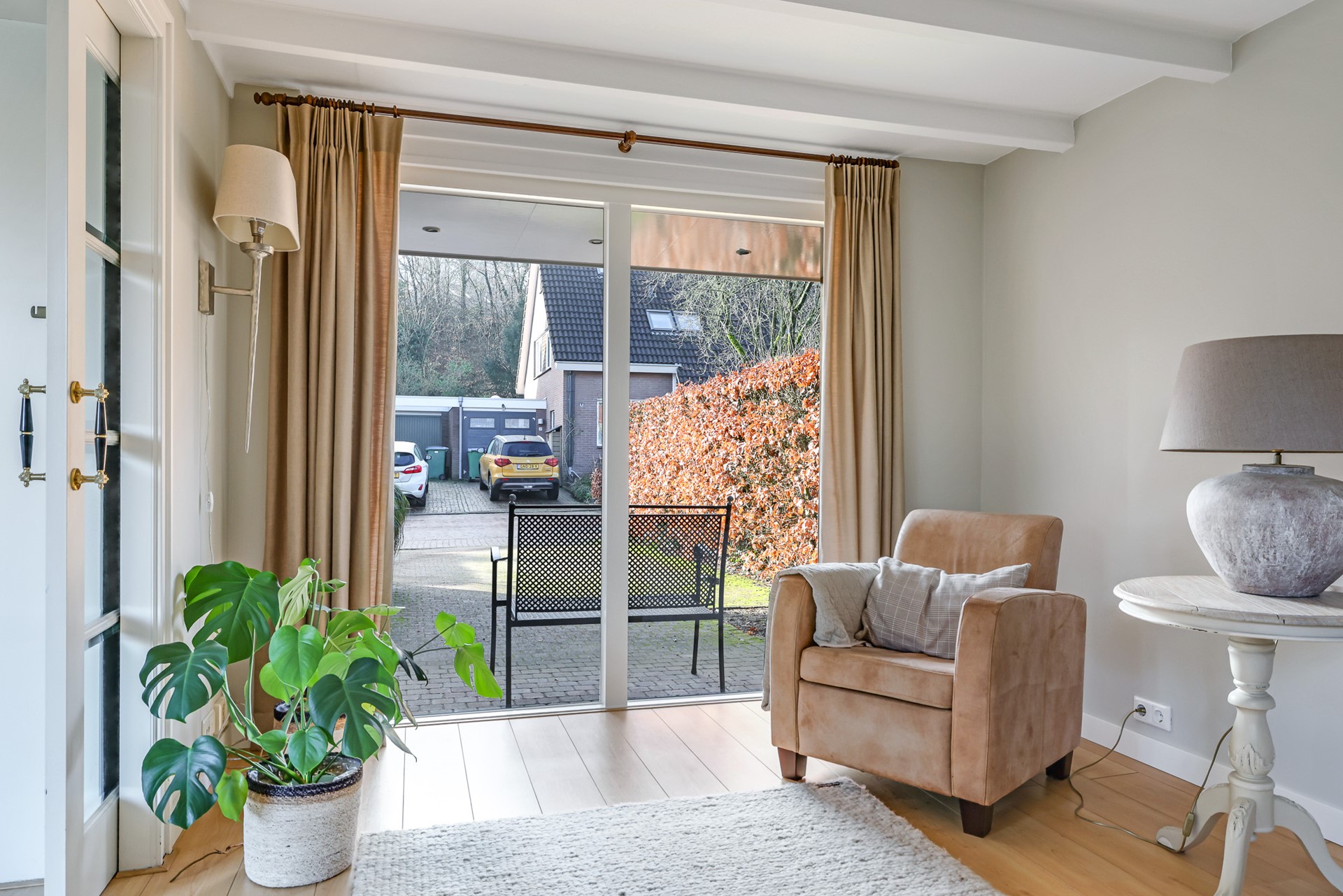 A charming detail is the set of en-suite doors between the living room and the adjoining sitting room. This additional room is spacious, bright and multifunctional — ideal as a comfortable TV or reading room, but equally suitable as a home office. The light beam ceiling adds character, and from here you can also step straight into the garden.