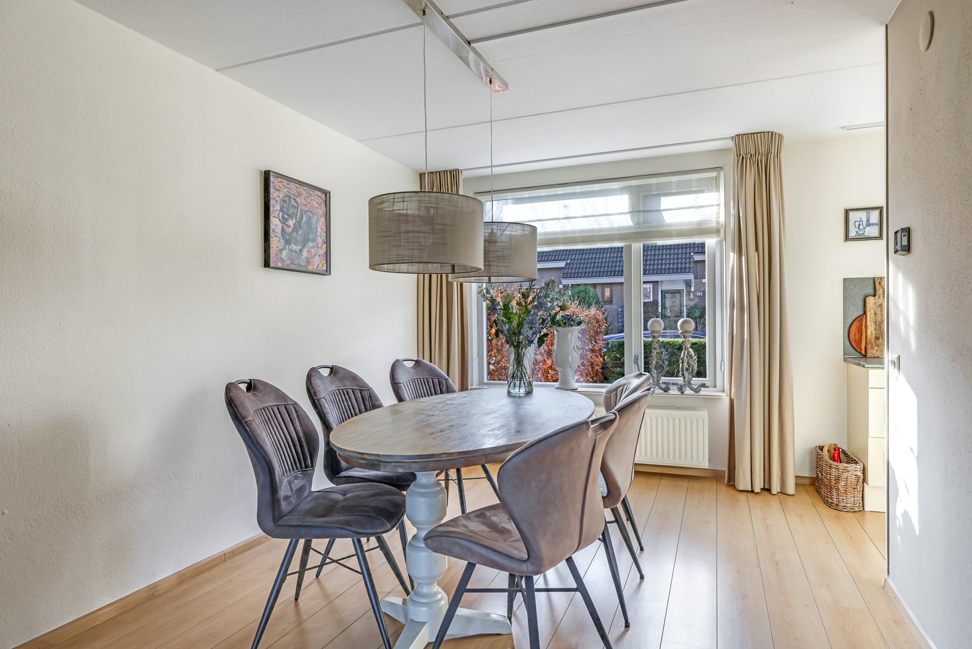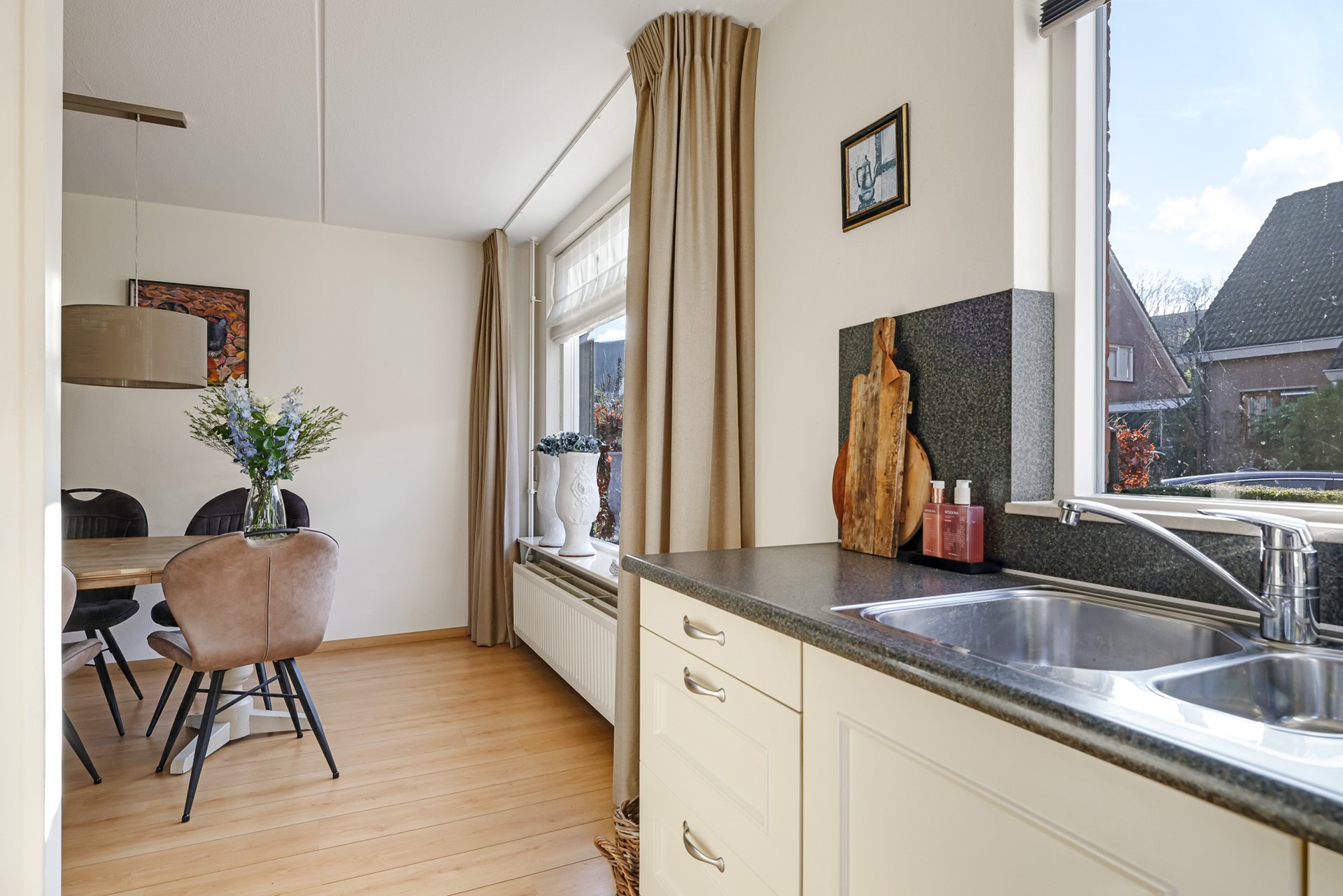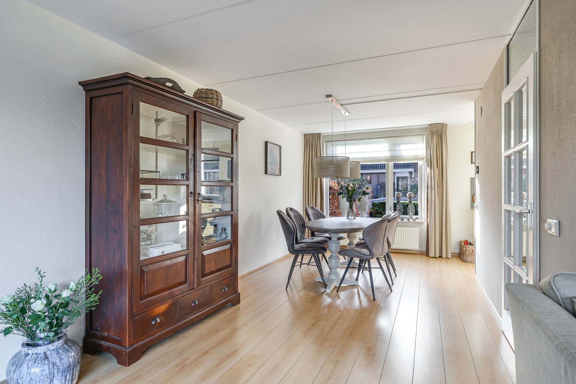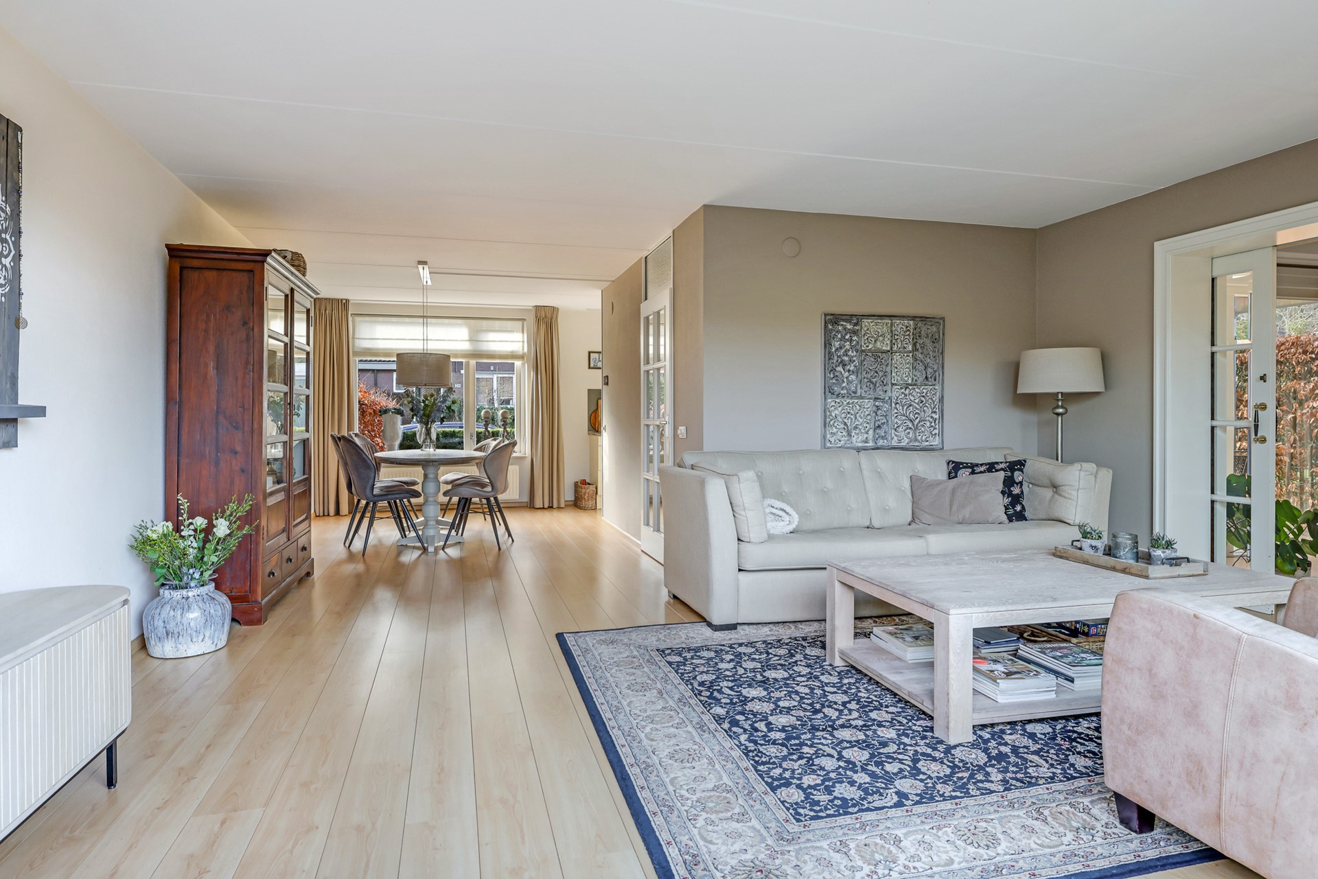 A charming detail is the set of en-suite doors between the living room and the adjoining sitting room. This additional room is spacious, bright and multifunctional — ideal as a comfortable TV or reading room, but equally suitable as a home office. The light beam ceiling adds character, and from here you can also step straight into the garden.