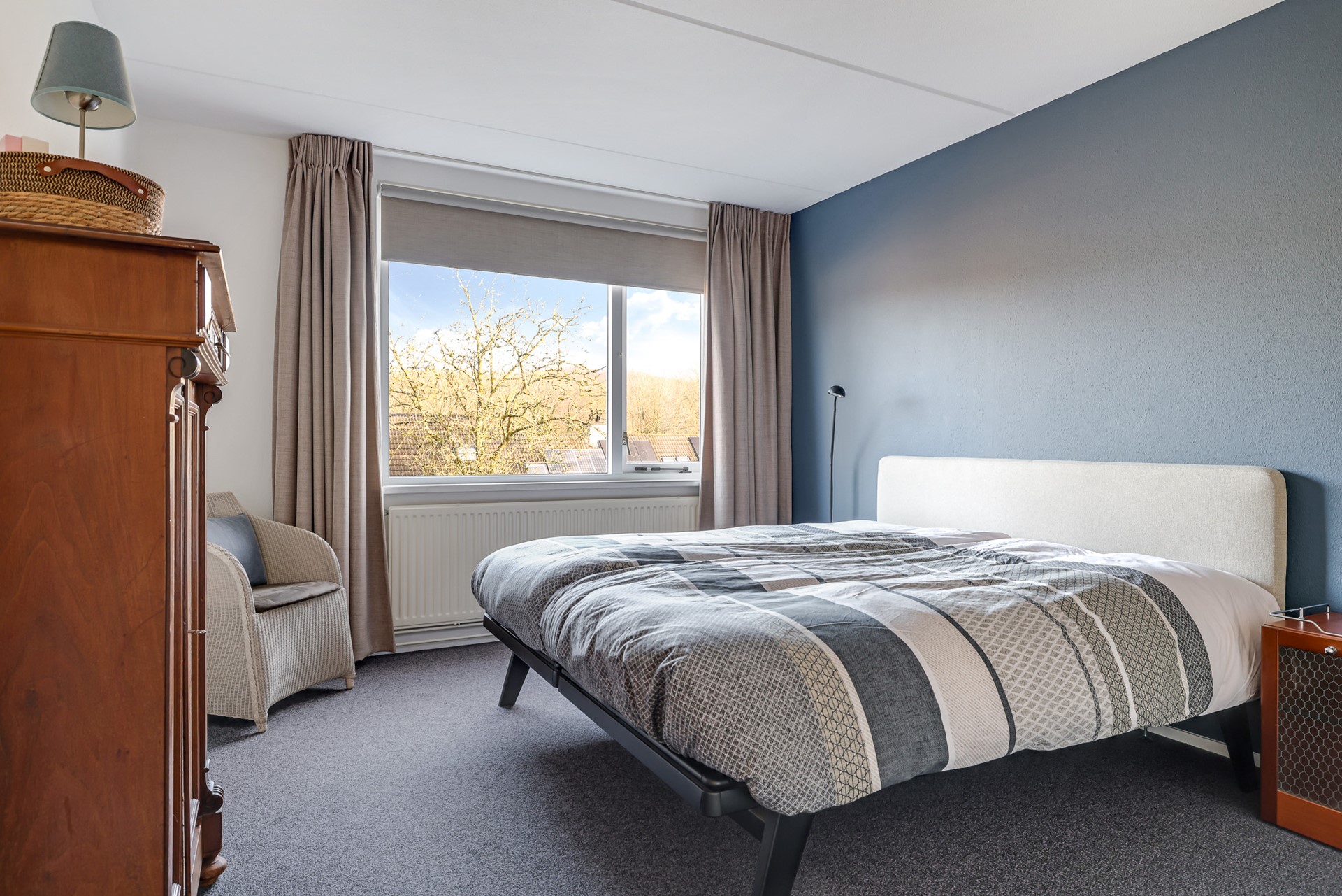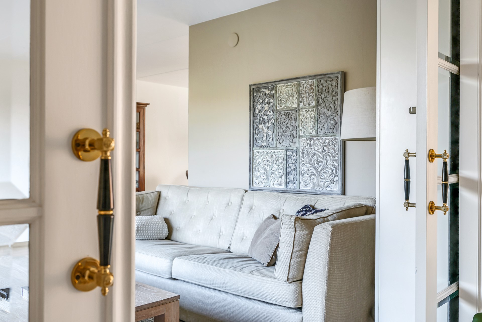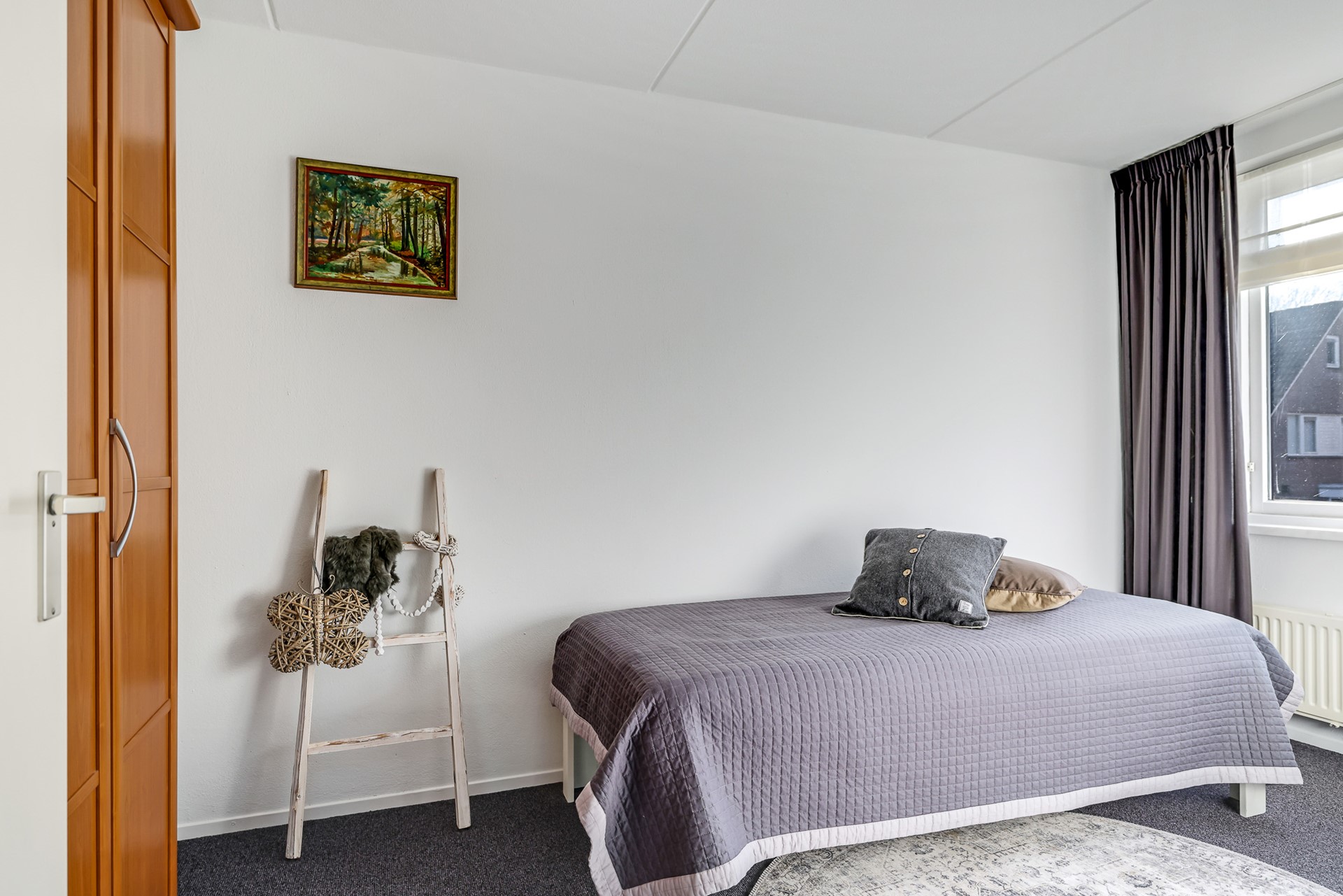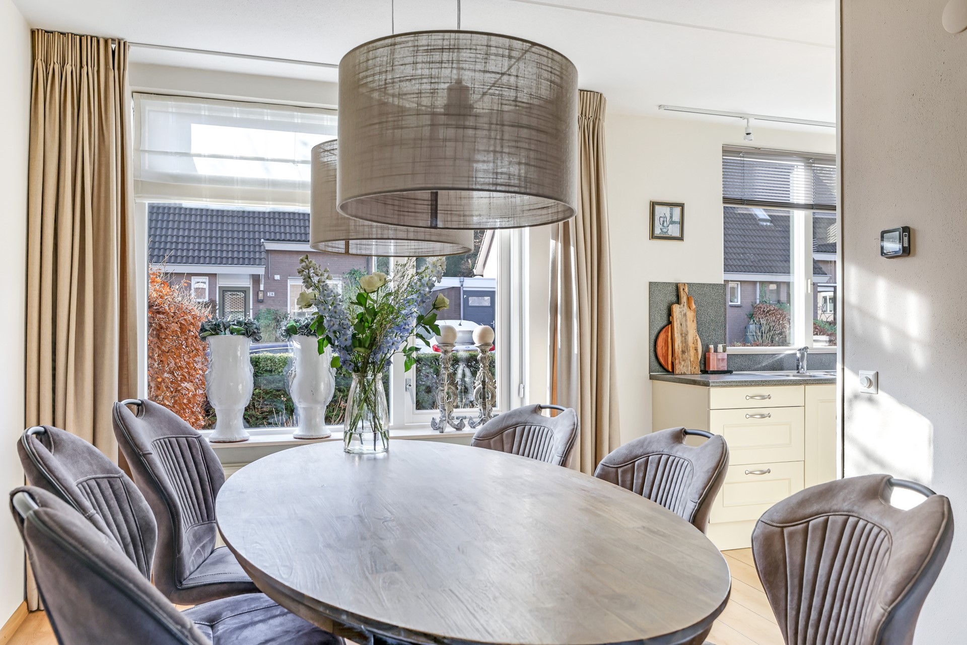 A charming detail is the set of en-suite doors between the living room and the adjoining sitting room. This additional room is spacious, bright and multifunctional — ideal as a comfortable TV or reading room, but equally suitable as a home office. The light beam ceiling adds character, and from here you can also step straight into the garden.