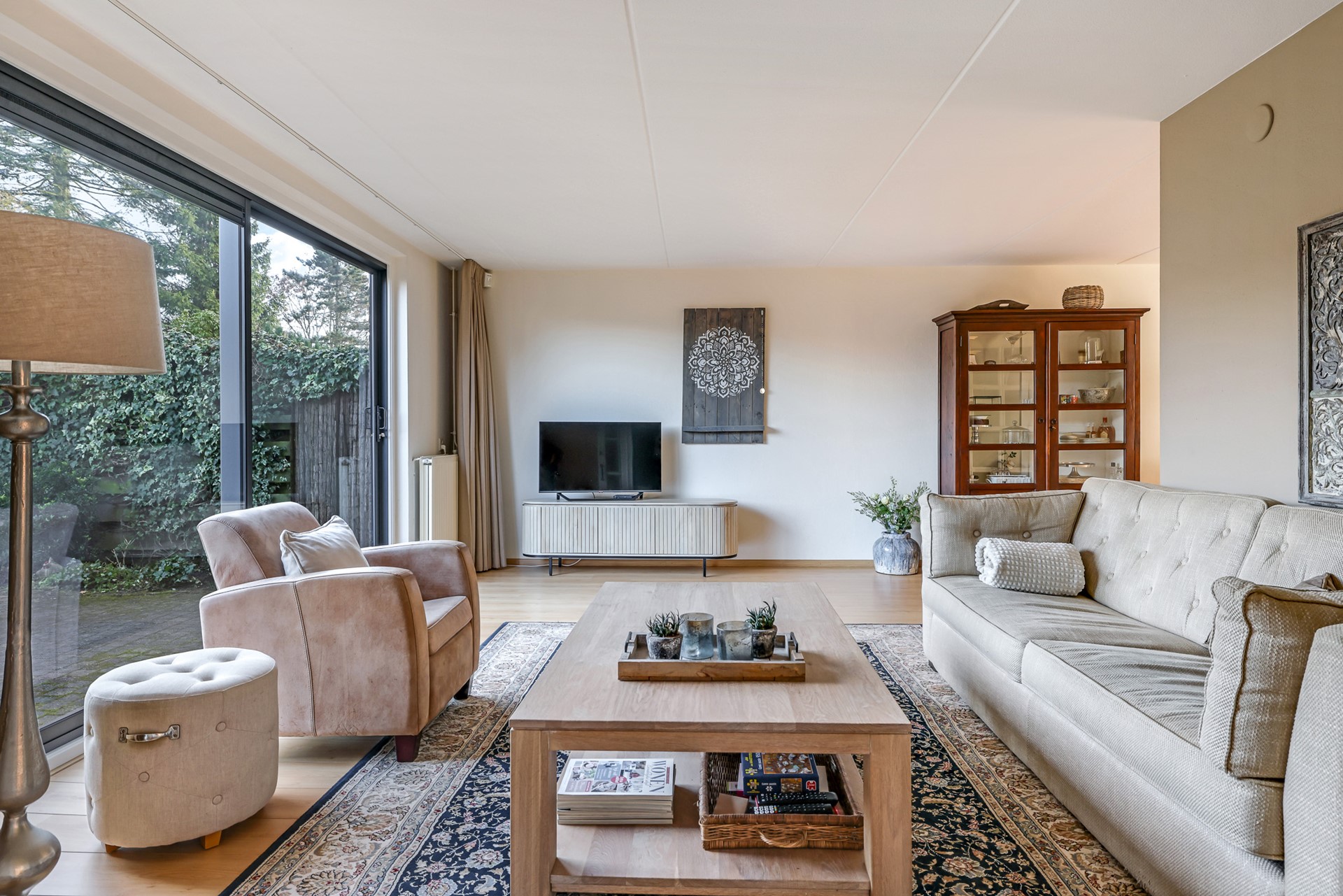 Vanuit de eethoek loop je door naar de woonkamer aan de tuinzijde. Dit is een moderne, lichte ruimte die met liefde is afgewerkt en meteen sfeer ademt. De grote schuifpui zorgt voor volop daglicht én dat fijne binnen-buiten gevoel: je kijkt uit op het groen en je staat zó in de tuin.