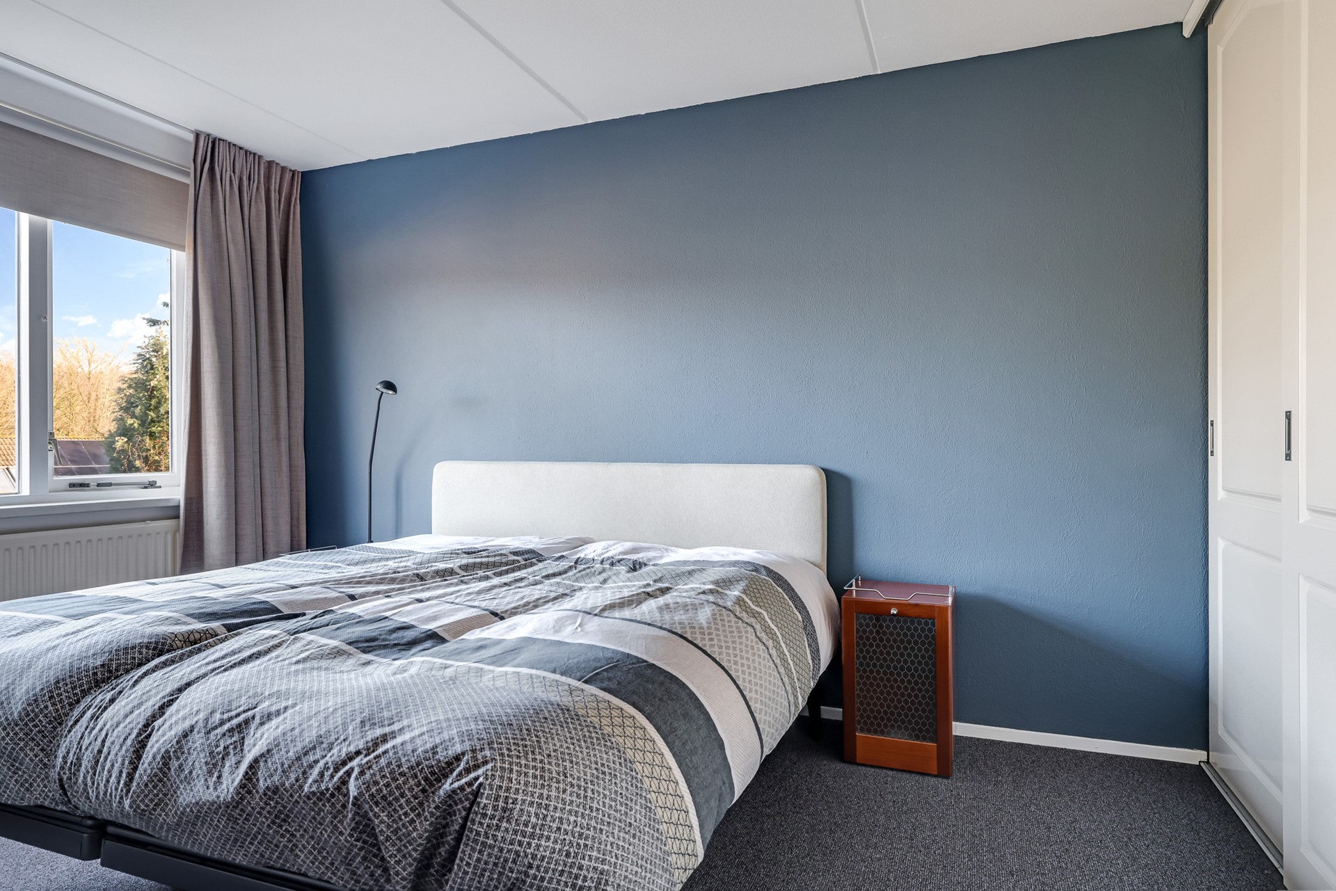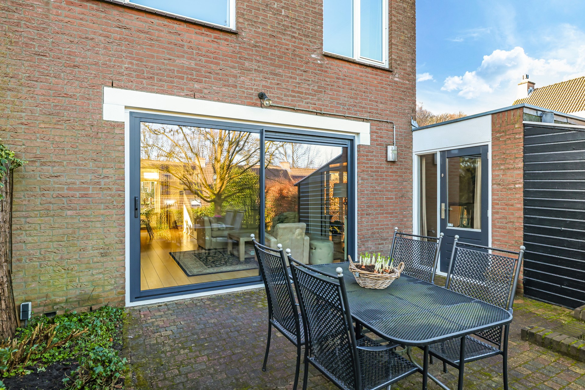 From the dining area, you continue to the garden-facing living room. This modern, bright space has been finished with care and immediately offers a warm and inviting atmosphere. Large sliding doors provide abundant natural light and create a seamless indoor-outdoor connection, with direct access to the garden.