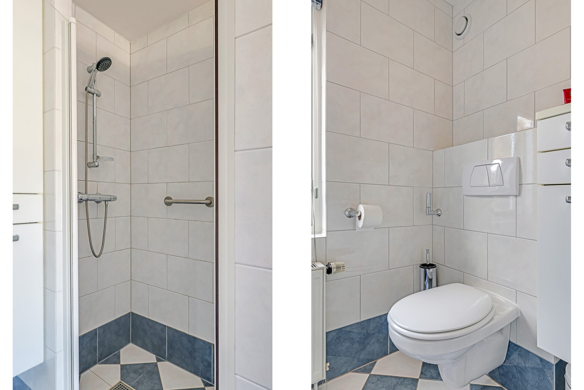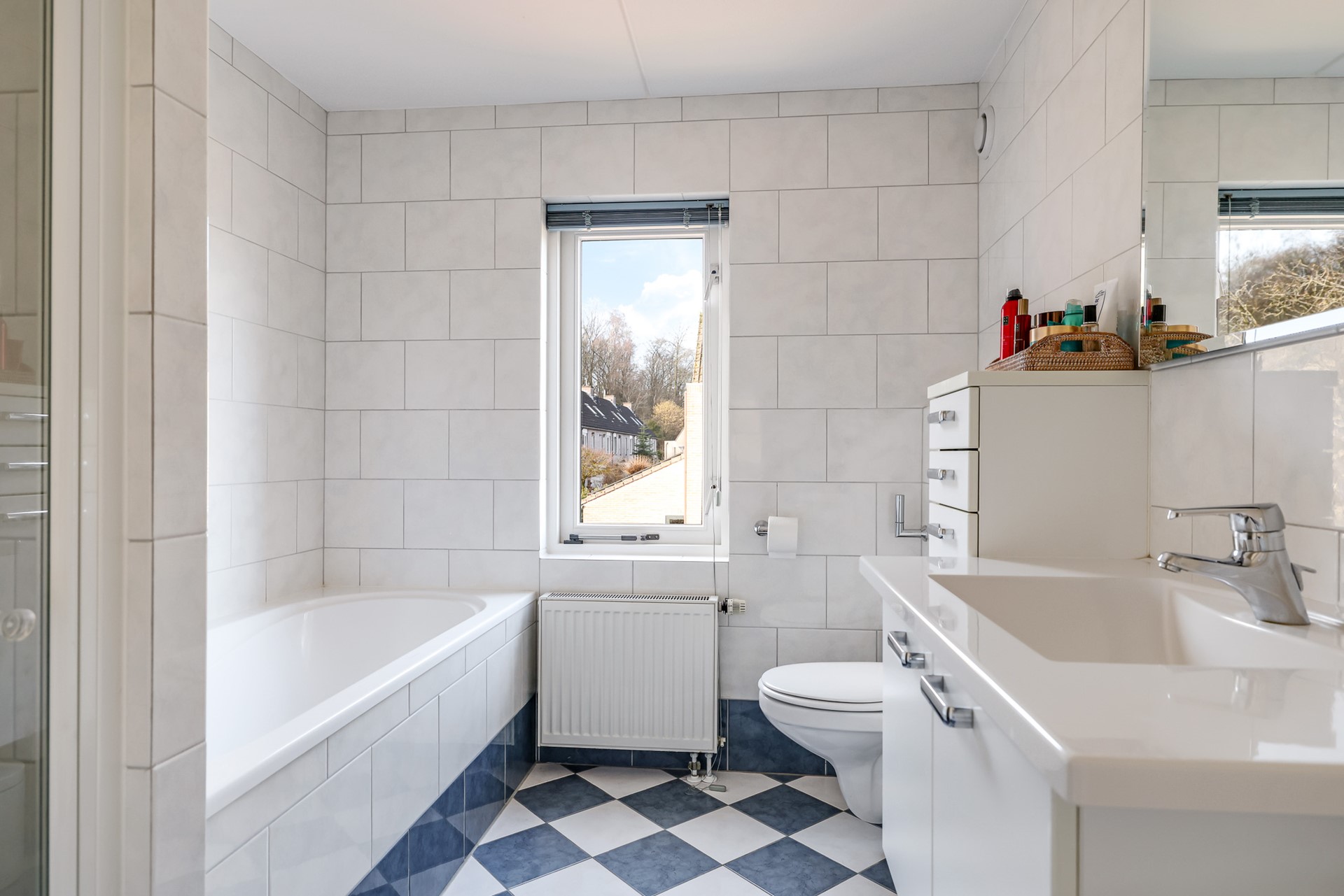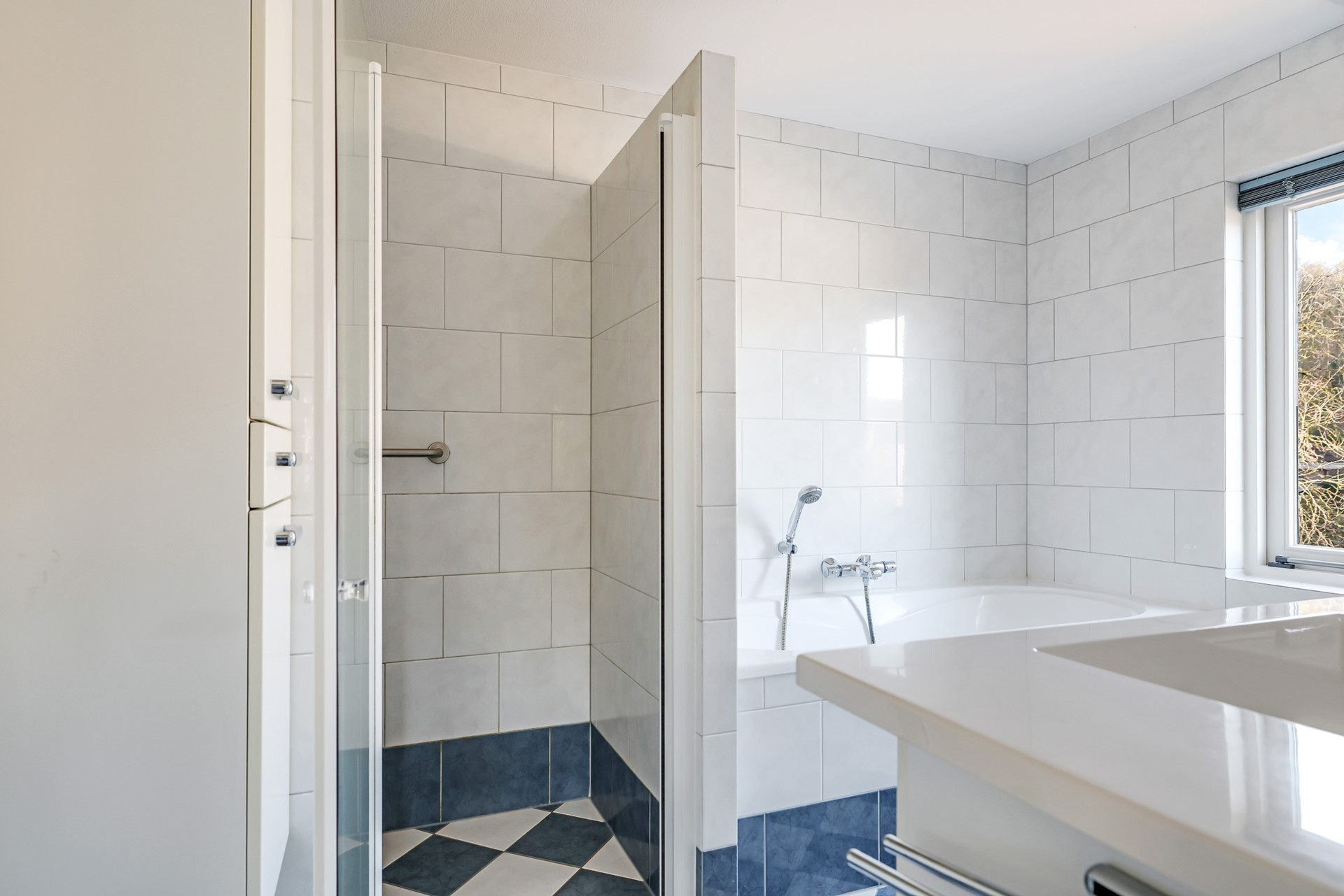 The bathroom is pleasantly bright and well-sized, equipped with a bathtub, walk-in shower, washbasin and toilet.